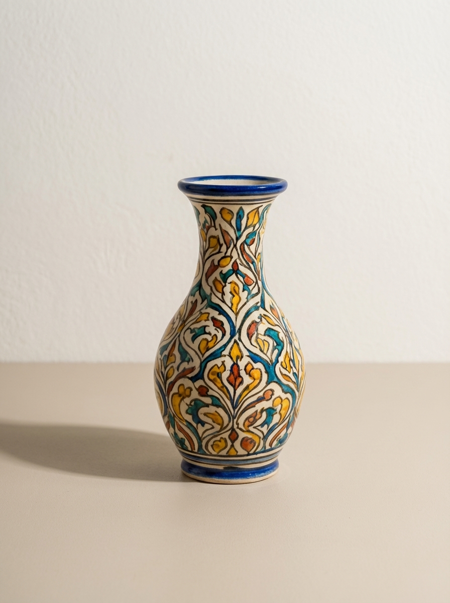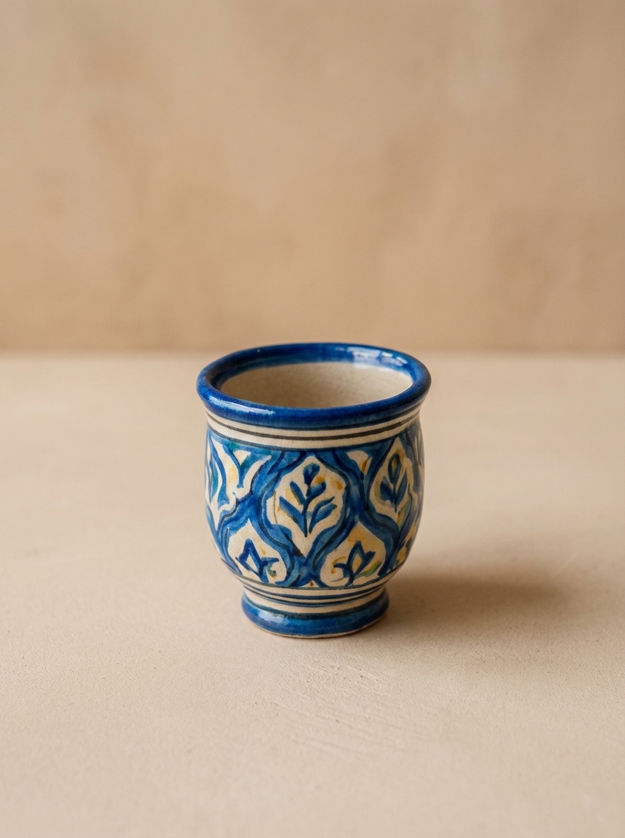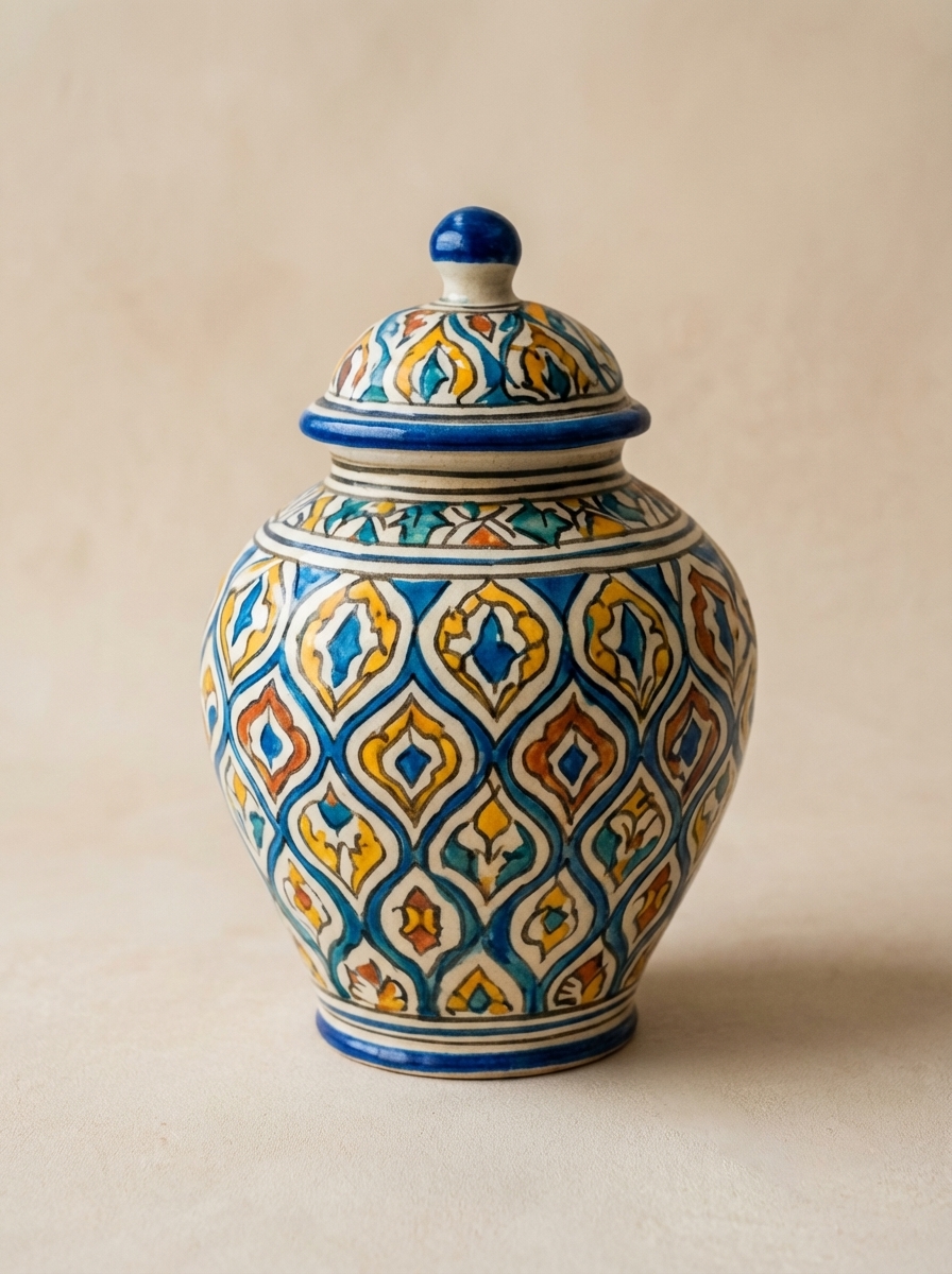 طقم خزف متكامل بستايل مغربي وأندلسي، مرسوم ومزخرف يدوياً بالكامل. الطقم مكون من 4 قطع: طاجين للتقديم، وعاء تخزين بغطاء، فازة، وكوب صغير. ألوانه المبهجة وتداخل الأزرق مع الأصفر بيدي حيوية وشياكة للمكان. تقدر تستخدمه كطقم تقديم مميز جداً على سفرتك، أو توزعه كقطع ديكور فنية تخطف العين في مطبخك أو غرفة المعيشة. كل قطعة فيهم بتعكس تفاصيل وروح الشغل اليدوي.