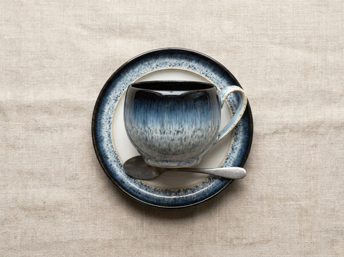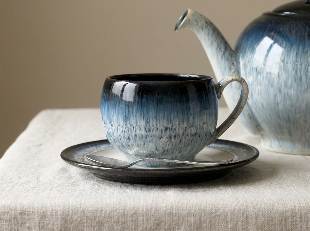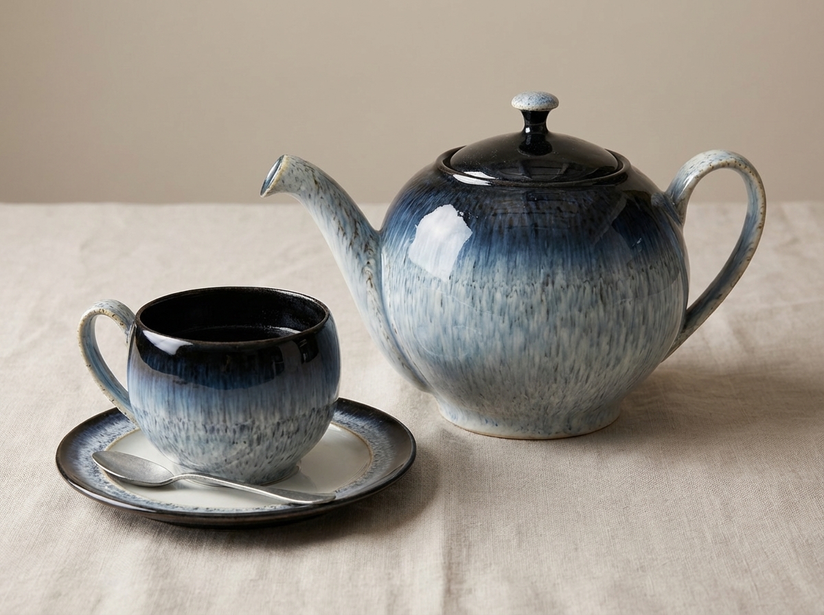 طقم شاي فردي من السيراميك بستايل "ستوديو الخزف" الكلاسيكي. بيتميز بتقنية الطلاء التفاعلي اللي بتدي تدرج لوني فريد بين الأزرق الكحلي الغامق والأبيض الثلجي، وده بيخلي كل قطعة ليها بصمة مختلفة ومفيش منها نسختين متطابقين. الطقم مكون من براد وكوب مع طبق تقديم صغير ومعلقة، عملي جداً لجلسات الشاي الهادية، أو كهدية قيمة لعشاق الخزف اليدوي. المواصفات: الخامة: سيراميك بطلاء تفاعلي لامع (آمن للاستخدام اليومي) المحتويات: براد شاي بغطاء، كوب، طبق تقديم، معلقة اللون: تدرج عشوائي من الكحلي للأبيض المنقط السعة: البراد 800 مل تقريباً، الكوب 250 مل تقريباً الوزن: 1.5 كجم تقريباً الاستخدام: لتقديم الشاي والمشروبات الساخنة