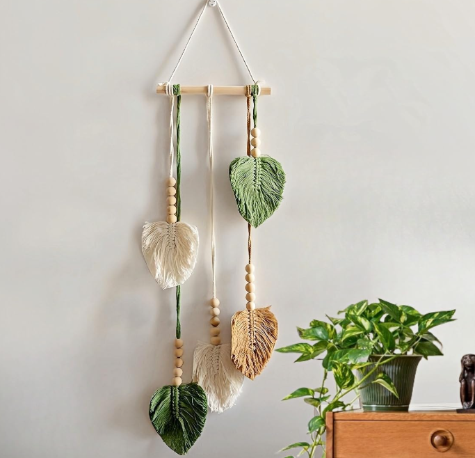 • لوحة جدارية من أوراق الشجر بتقنية المكرمية: قطعة ديكور جدارية مزينة على شكل أوراق شجر، تناسب جميع أنواع الغرف. يضفي اللون الأخضر حيوية على الغرفة، وهي قطعة فنية مثالية للتعليق فوق السرير أو سرير الأطفال، أو الأريكة، أو رف المدفأة، أو المكتب. كما يمكن تقديمها كهدية للأصدقاء أو العائلة في عيد الميلاد، أو أعياد الميلاد، أو حفلات الزفاف، أو عند الانتقال إلى منزل جديد.