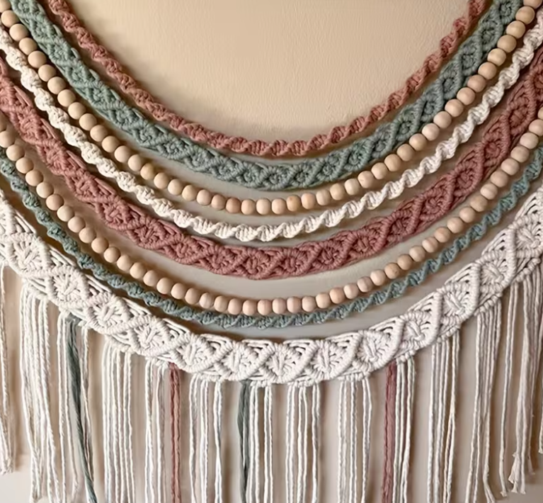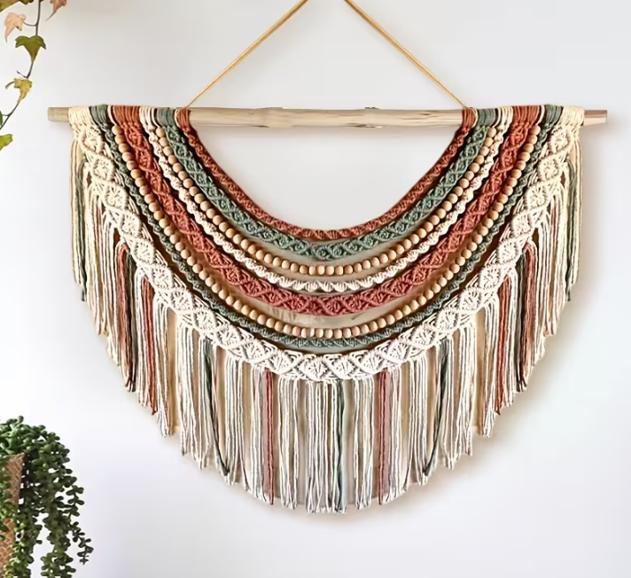 • قطعة ديكور حائط مميزة مصنوعة يدويا بفن المكرميه, بتصميم نصف دائري أنيق وألوان متناسقة تضيف لمسة دافئة وعصرية لأي مساحة في منزلك