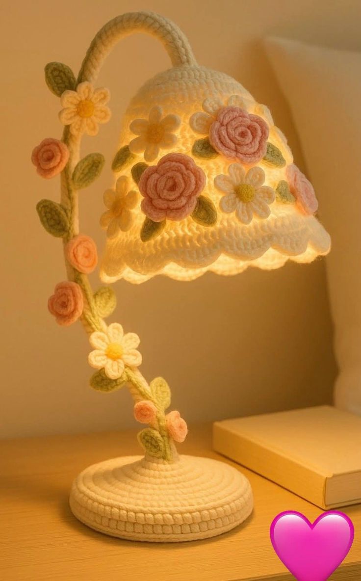 غطاء المصباح (الظلال): محبوك بغرز واسعة تسمح بمرور الضوء، ومزين بزهور بارزة بألوان (الوردي، البرتقالي الفاتح، والأبيض مع قلب أصفر).